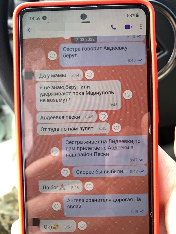 Судя по фото экрана телефонов задержанных, их владельцы обвиняли ВСУ в обстрелах мирных жителей, а также хотели бы, чтобы украинских военных поскорее "выбили" из Авдеевки.