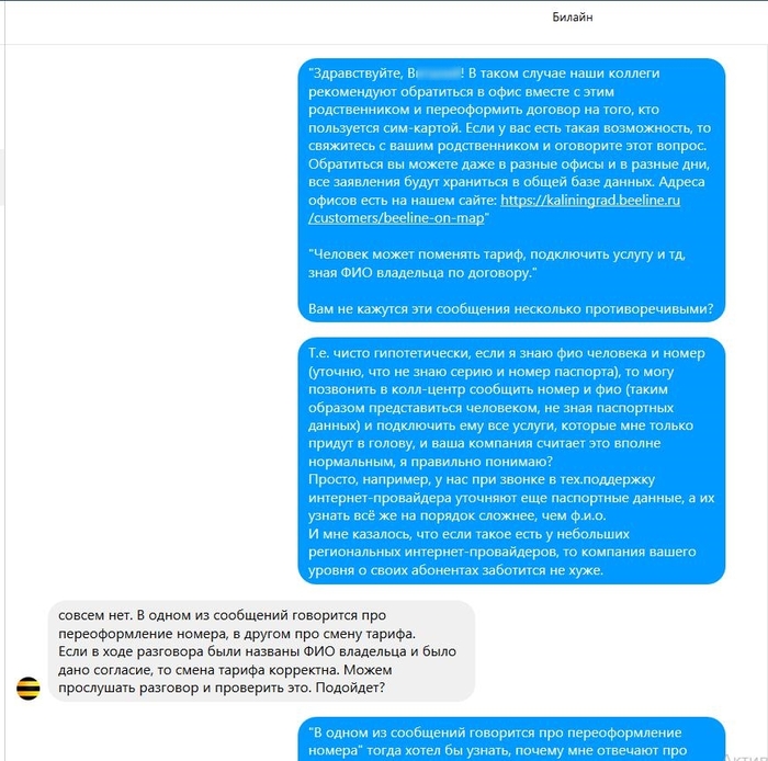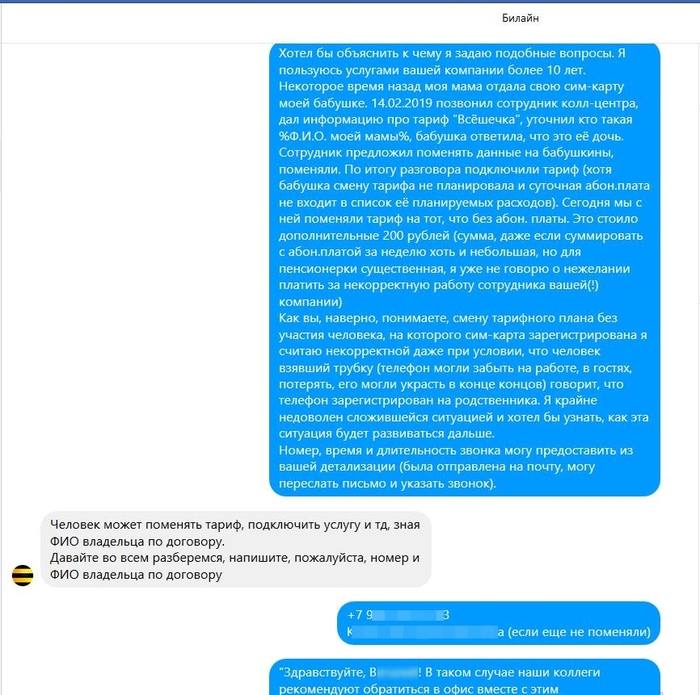 Сразу скажу, допускаю вариант, что предлагали перейти на новый тариф и бабушка могла согласиться по незнанию. Но есть одно "но", сим-карта зарегистрирована на мою маму, т.е. бабушка не является собственником сим-карты. В таком случае она должна была по логике назвать ф.и.о. мамы и паспортные данные (серию и номер). По факту у неё уточнили кто такая %ф.и.о. мамы%, на что она ответила, что это её дочь. Всё, этого оказалось достаточно.
