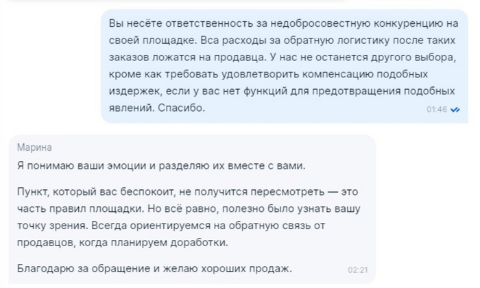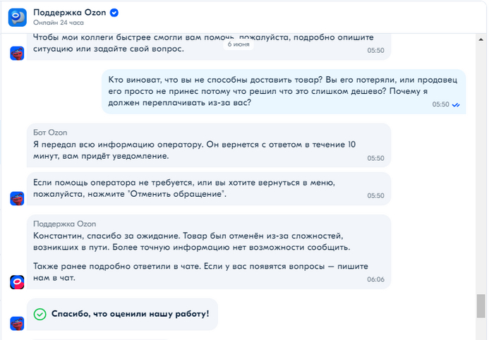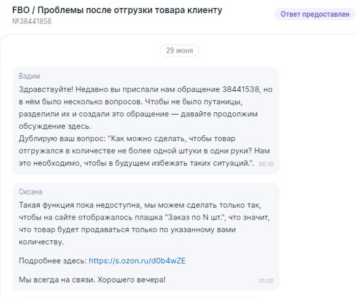 Мы связались со службой поддержки и предложили ввести функцию отгрузки товара в одни руки, чтобы больше не допустить подобных случаев. Озон в позитивно-задорной манере послал нас подальше и пожелал хорошего вечера: