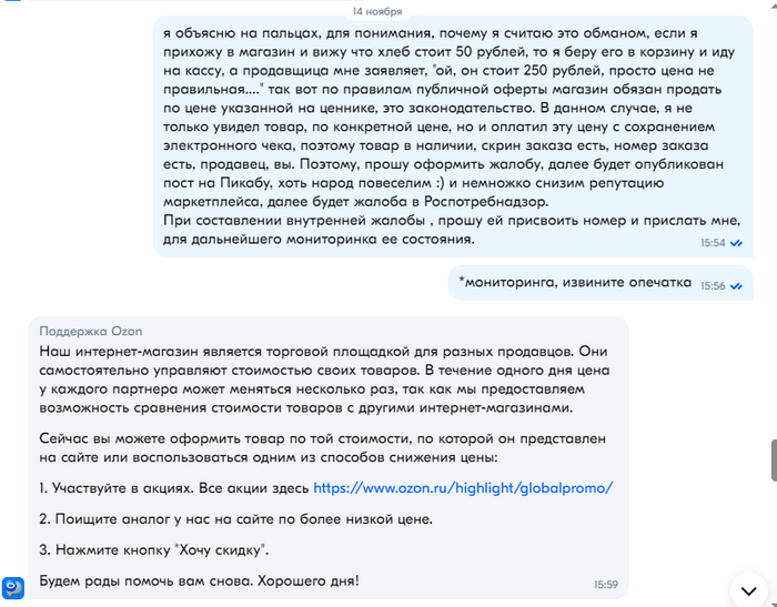 Забавы ради попробовал написать в техподдержку, операторы у Озона заслуживают отдельного абзаца, они вообще не понимают что происходит и в чем обман? и ведут себя так как будто им перед работой раздают какие то легкие наркотики, например один из обмороков предлагал воспользоваться сервисом "Хочу скидку", но на этот товар этот сервис не работает, это я уже сам выяснил))))