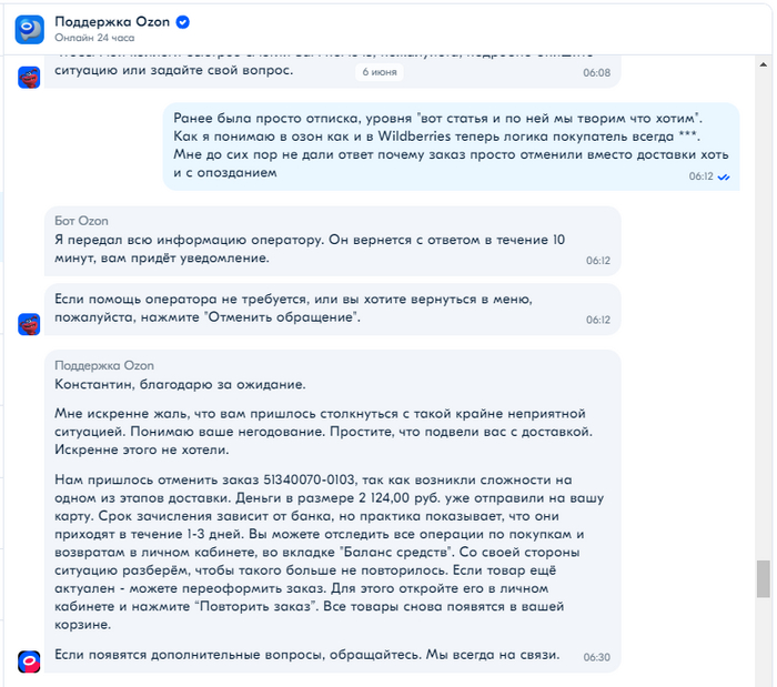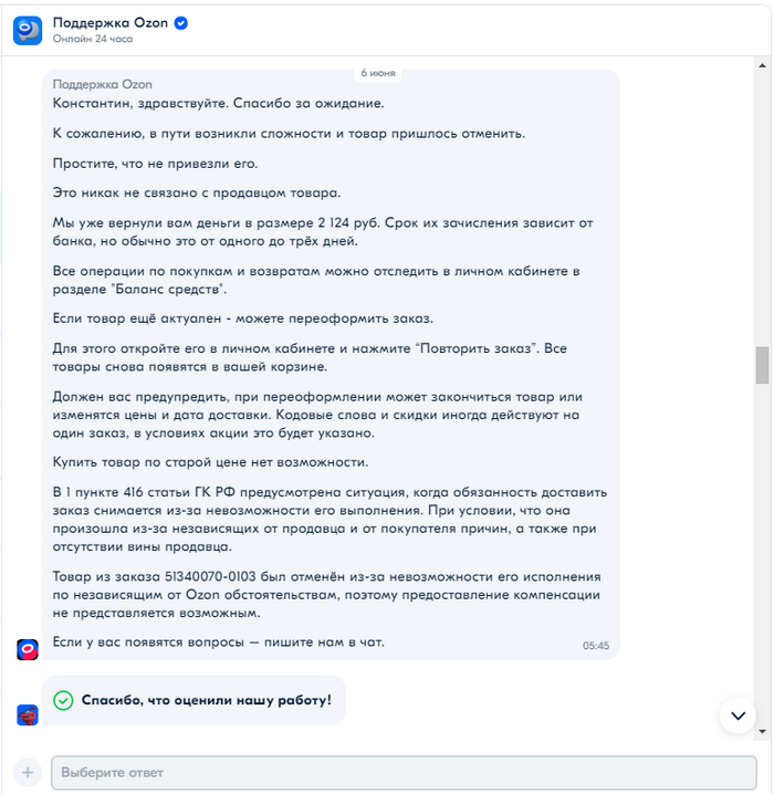 Озон отменил заказ