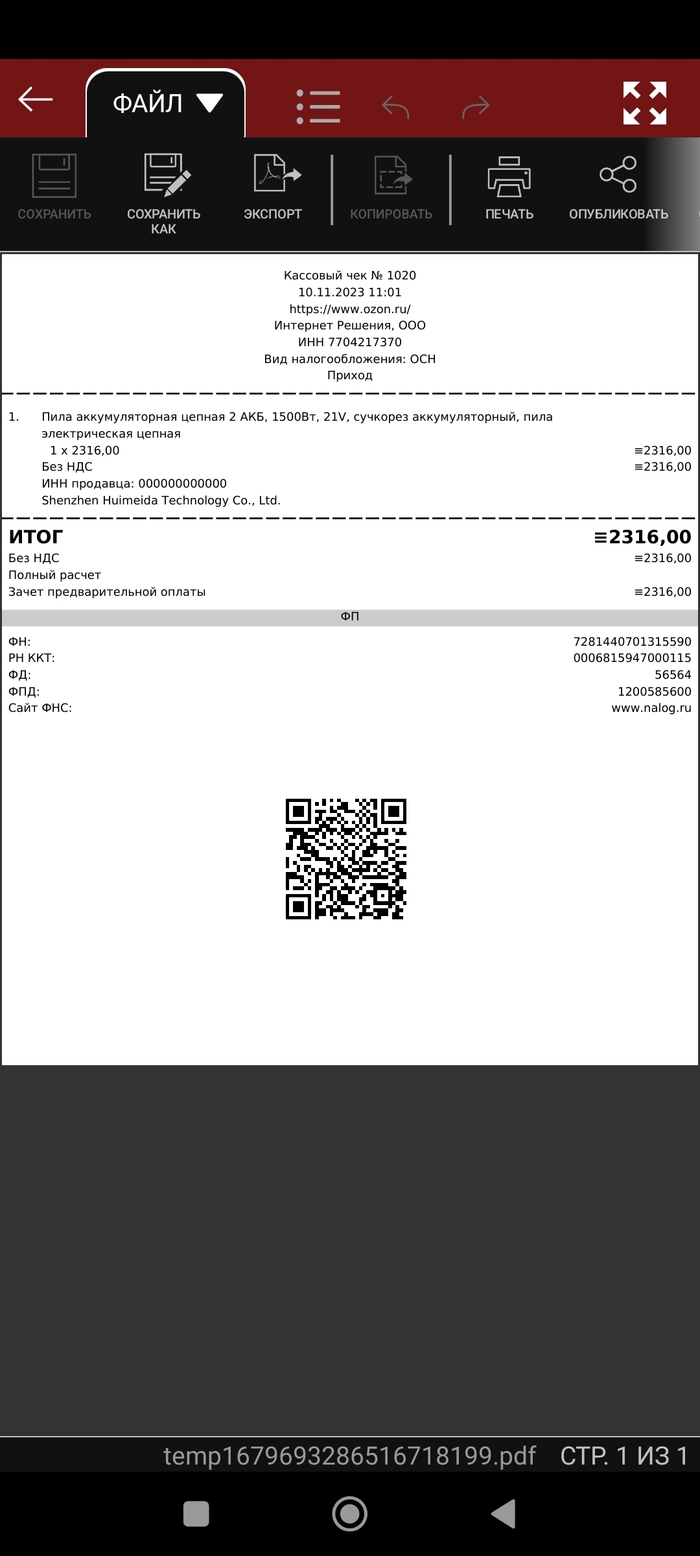 Далее доставка, распаковка и первое использование. Отец был доволен, так как в течении двадцати минут он спилил все ветки на придомовом участке. После этого аккумулятор разрядился и отец установил второй, ранее заряженный аккумулятор. Но радость быстро сменилась разочарованием. Аккумулятор проработал секунд десять. После этого аккумуляторы были снова заряжены. Результат тот же - десять секунд работы без нагрузки и пила останавливалась. Решили написать продавцу. Он попросил написать номер заказа и прислать видео работы пилы. Всё сделали. После этого поступило предложение отправить товар продавцу. Хорошо! Но тут выясняется, что продавец находится в Китае! При оформлении заказа в карточке товара никаких отметок о заказе из-за рубежа не было! На почте рассчитали стоимость отправки в размере 2500₽, что превышает стоимость покупки.