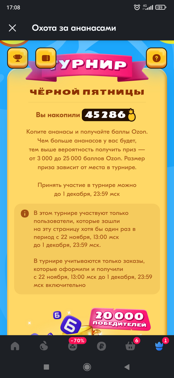 Пишу свой первый пост, часто сижу на Пикабу и наблюдал что люди пишут что все акции маркетплейсов - развод. Решил поучаствовать в акции озона "найди ананасы" целых два раза получал призы в виде 25к озон баллов, был этому очень рад