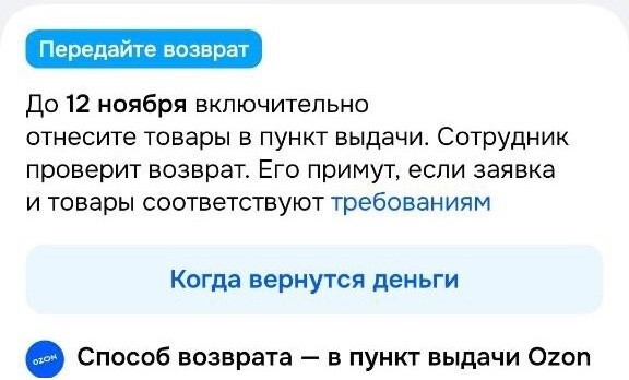 В комментариях к предыдущему посту было много вопросов и отзывах о возвратах, поэтому спешу поделиться информацией. Ремарка – актуальность данных на 08.11 и только для озона. Правила меняются достаточно часто, поэтому какие-то моменты могут быть неактуальны, когда вы прочитаете этот пост. И касается только ПВЗ, разные курьерские доставки, доставки силами продавца проходят мимо нас. Также мне абсолютно неведомо, почему не согласуют некоторые заявки на возврат, или будете ли вы общаться с ботом и живым продавцом на сайте марктеплейса.