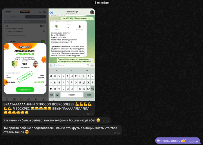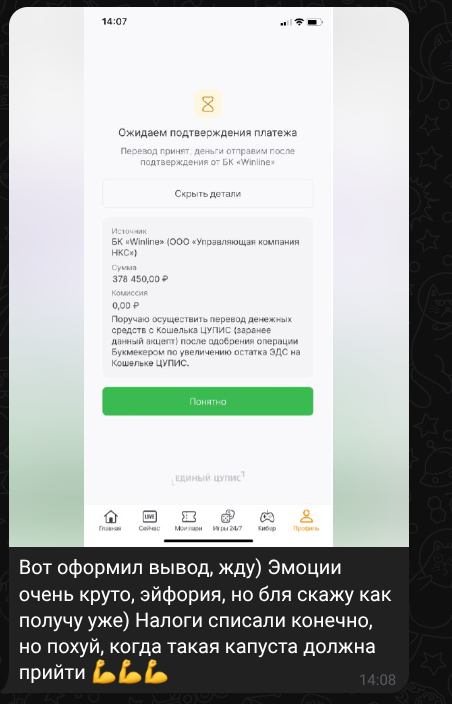На следующий день Валера очень радовался, так как ставка сыграла. Он вложил 1100$ инсайдеру + ставка 15 т.р. и выиграл 378 т.р.!!! Вот это да! Кто бы мне рассказал раньше про эту схему...