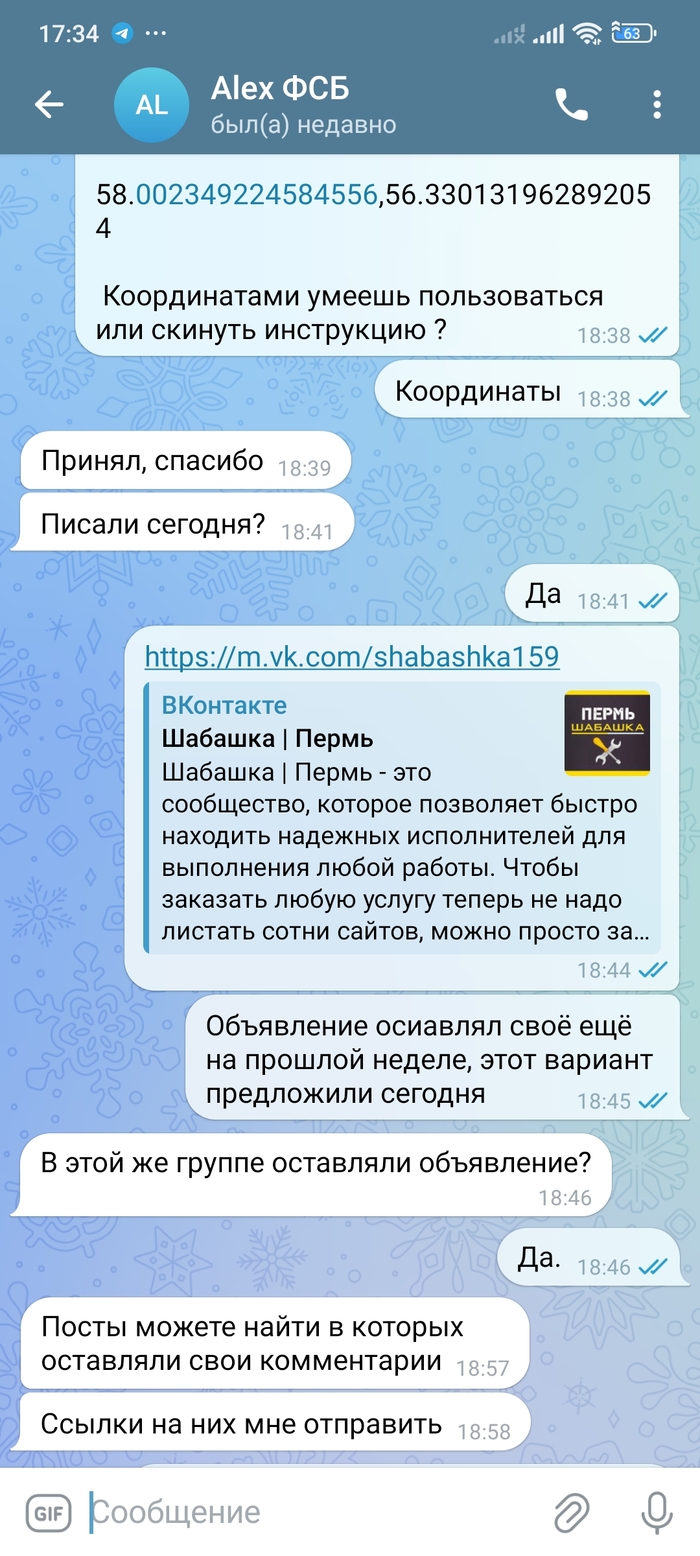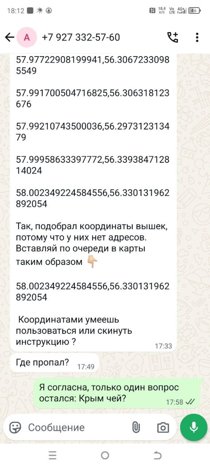 Шутки шутками, а моей жене пару месяцев назад предложили "подработку"... хорошо, что сразу мне показала: типа, гляди, какая простая работа- сфоткать вышки сотовой связи! Я проявил бдительность, позвонил в ФСБ по Пермскому краю, они проявили живой интерес, видимо, это было тогда что-то новенькое, сотрудник сначала попросил продиктовать переданные координаты вышек, но там большие цифры, поэтому тут же связался со мной в телеге, где я ему всё подробно расписал. Месяц спустя увидел в новостях, что в какой-то другой области подпалили вышку- видимо, это был следующий этап развода после "фотографирования". А в Пермском крае, я, получается, помог предотвратить подобные терракты! Служу России!.. и жду свою медальку)