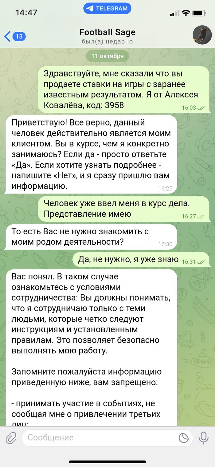 В прикрепленном файле оооооочень длинная переписка Валеры с каким-то Михаилом, который в процессе рассказывает ему, что знает схему о том, как делать ставки чтобы выигрывать.