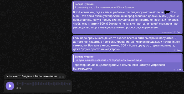 На следующий день Валера ответил мне, что в Балашихе "айтишники", внезапно, получают по 500 000р.