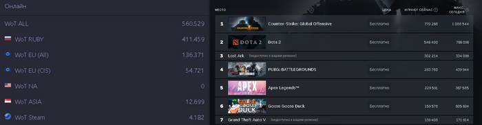 Второй существенный довод, который многих удивляет и заставляет попробовать World of Tanks - это высокий онлайн игры. Лично для меня было шоком когда-то узнать, что онлайн только RU серверов World of Tanks сравним с мировым онлайном таких популярных сетевых проектов, как Dota 2, CS: GO, Lost Ark и т. п. А если учитывать, что всё это без какой-либо возможности зарабатывать на скинах или как-то выводить игровую валюту в реальные деньги, то результат потрясает.