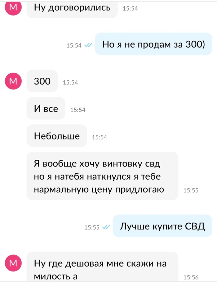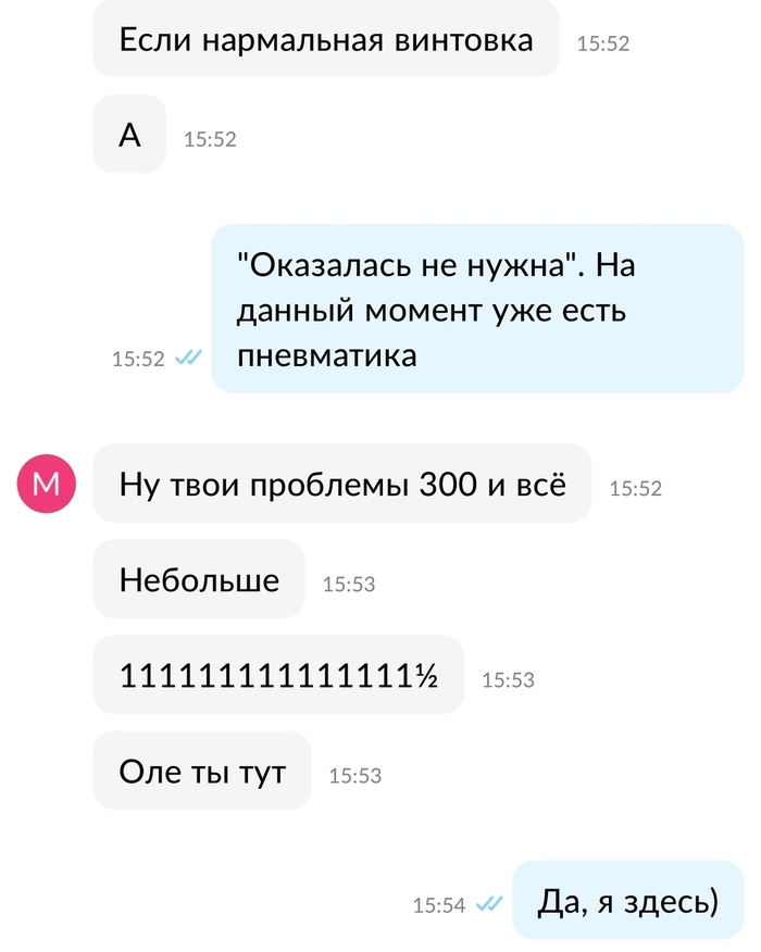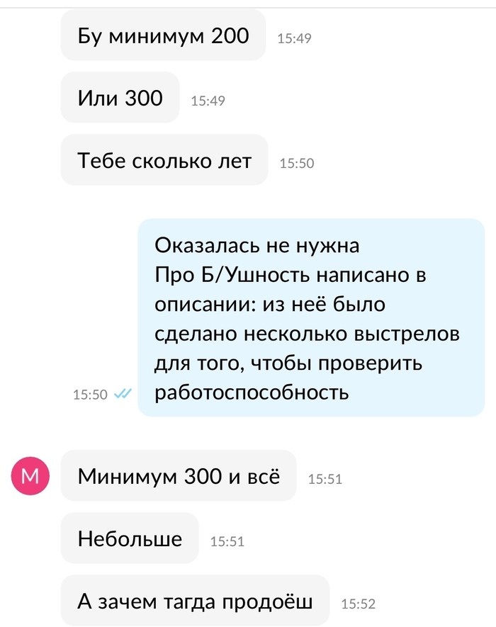 О ценообразовании: покупалась винтовка и правда за 1000 с небольшим рублей, в тот же день сделал несколько выстрелов и бросил её в шкаф. Отчаявшись найти покупателя, я снижал цену с 900 до 800, остановился на 600, в этот момент главный герой мне и написал.