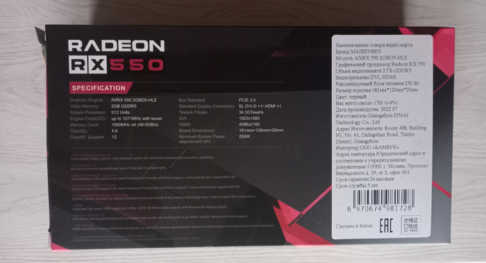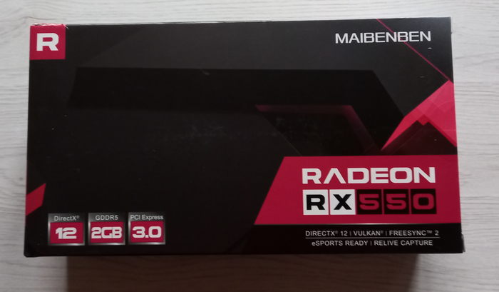 Поставляется видеокарта Maibenben Radeon RX 550 в весьма качественной для своей цены картонной коробке, на лицевой стороне которой кратко представлены спецификации устройства.