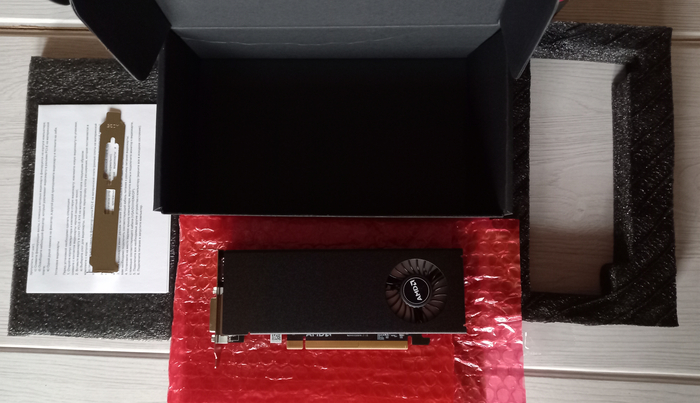 Сразу сто́ит отметить, что компания Maibenben не поскупилась на качественные меры защиты. Внутри коробки находится весьма презентабельный чёрный кейс, в котором содержится видеокарта, усиленная несколькими защитными вставками из чёрной пены. Так что, несмотря на работу нашей почты, можно быть уверенным в сохранности устройства. Комплектация базовая для такого ценового сегмента и состоит из переходника на полноразмерные корпуса, а также инструкции по установке и эксплуатации видеокарты. Привычного CD-диска с видеодрайверами на удивление, нет.