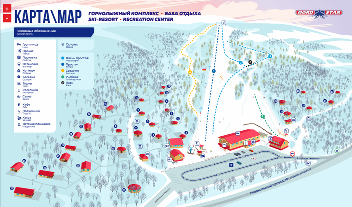 Для гостей комплекса подготовлены четыре горнолыжные трассы разного уровня сложности: зелёная, красная и две синие. Склон оснащён системой искусственного оснежения, что позволяет поддерживать отличное качество покрытия на протяжении всего сезона. В тёмное время суток все трассы освещаются — особенно это важно в период полярной ночи. К вершине горы туристов доставляет бугельный подъёмник. Для отдыхающих предусмотрена комфортабельная гостиница, а перекусить можно в уютном «X-баре». Также, рядом, после катания, можно провести время в беседках.