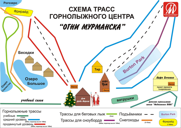 Помимо горнолыжного склона на курорте проложены трассы для беговых лыж, есть склон для сноутюбинга, трассы для снегоходов. Склон отлично подойдет как новичкам, так и опытным горнолыжникам и сноубордистам. Наверх туристов поднимает бугель. Поскольку курорт расположен практически в городской черте, в Первомайском округе, то поселиться можно в любой из мурманских гостиниц. Но для тех, кто не желает тратить время на дорогу, прямо рядом со склоном работает отель «Огни Мурманска» на 39 номеров. В ресторане отеля с видом на окрестности всегда можно пообедать или выпить горячего чаю. Есть две смотровых площадки — одна площадка недалеко от склона, вторая расположена на вершине склона. Также, рядом есть кафе и тропическая купальня.
