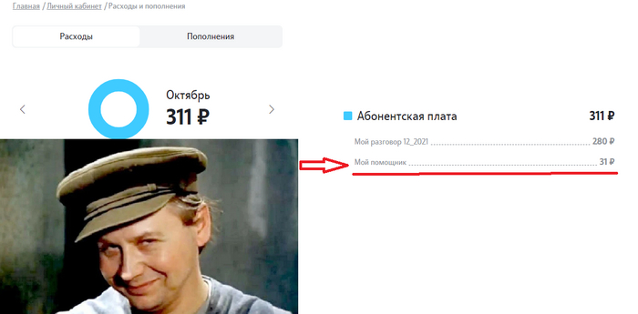 Молодой человек терпеливо выслушал мою проблему и очень удивился, что я ничего не знаю про услугу «Мой помощник». Оказывается, эта услуга входит в мой тариф и была активирована с первого дня подключения. Первый месяц услуга предоставляется бесплатно, а потом снимается по рублю в день. Везде абонентская плата указывается 280 рублей, а в реальности снимали 311 рублей. Наперсточники 90х просто отдыхают рядом с такими коммерсантами.