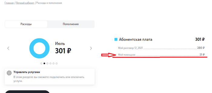 Прогулявшись по пунктам меню Личного Кабинета натыкаюсь на раздел «Расходы». Тут выясняется, что у меня списали 14 рублей за ДОПОЛНИТЕЛЬНУЮ УСЛУГУ «Мой помощник».