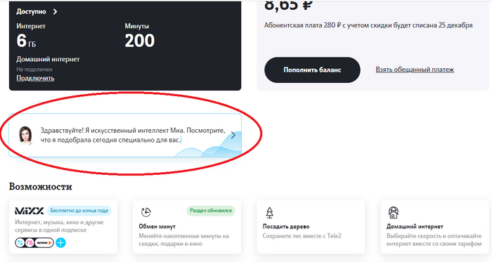Пока ждал ответа оператора я решил воспользоваться искусственным интеллектом Миа, которая назойливо предлагала свою помощь в Личном Кабинете.