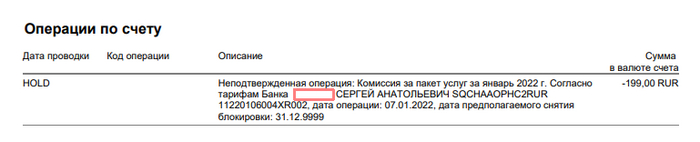 И опа, за указанные месяцы у меня стоят HOLD, но операция в статусе Не проведена. В 99% это означает следующее - при формировании комиссий произошел какой то сбой, робот создал проводку, которую бухгалтерия не провела (не было оснований, так как обслуживание бесплатное), но в системе поставился холд для блокировки денег. И такое произошло несколько раз в 2021 и в 2022 на общую сумму, которую я не досчитался. Почему в 2023 году не была списана комиссия? Скорее всего тимлид выдал все таки люлей программистам, которые писали скрипт начисления комиссий и они его исправили. Почему не откатили начисление? Видимо люлей выдал недостаточно или не до конца сформулировал задачу. В общем, холды остались. И как только на счет капнула денежка, сработало кривое удержание комиссии (кривое потому, что НЕЛЬЗЯ списывать комиссию по непроведенным начислениям) и сумма уменьшилась.