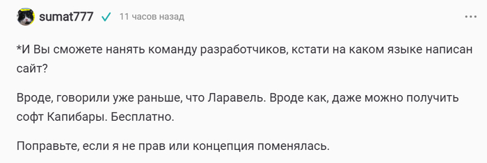 Я не могу нанять пока команду разработчиков т.к. ограничен в деньгах. Сегодня состоялись переговоры с создателям Капибары и мы не смогли договориться, придется делать свой подобный ресурс, но фиг знает когда я смогу это сделать. Идея как вывести его на самоокупаемость есть. Но я финансово точно не потяну один, хотя есть тоже пару идей, надо подумать.