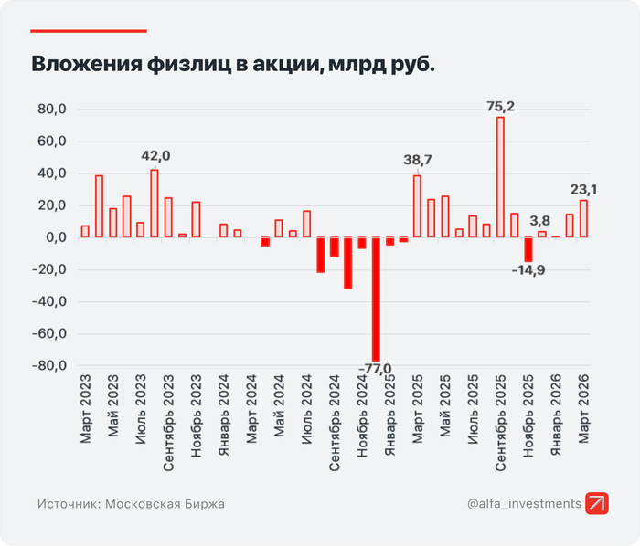 Число физлиц, имеющих счета на Мосбирже, за март увеличилось на 322 тысячи и достигло 41 млн, ими открыто более 78,3 млн счетов. В Марте было 3,2 млн активных инвесторов.