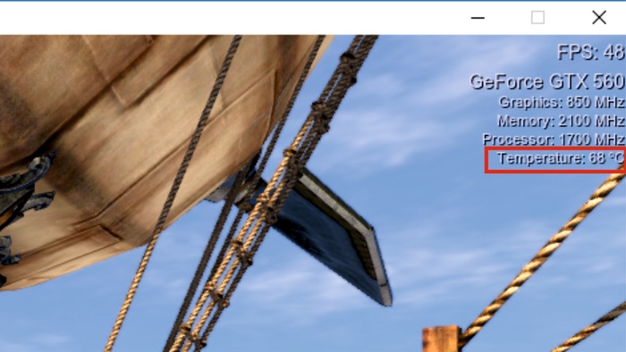 После запуска в правом верхнем углу будет отображаться информация о вашем видеочипе, количестве кадров в секунду и температура. Температура не должна превышать 70 градусов. Это не критический показатель для видеочипов, но его превышение уже тревожно. При повышении выше 75 пора думать о лечении системы охлаждения, и желательно не напрягать видеочип.