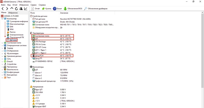 Так как вам не обязательно покупать диагностические программы, я покажу как проверить температуру на примере бесплатных. Температуру процессора и всех остальных компонентов кроме видеочипа, я рекомендую проверить условно бесплатной версией "Aida 64". Если не хочется удалять то что недавно было установлено - можно выбрать "Speecy". Как только вы установите и запустите аиду, вам нужно будет перейти во кладку "Компьютер -> Датчики", там и показывается информация о температуре с разных датчиков. Данные могут отличаться в зависимости от системы.
