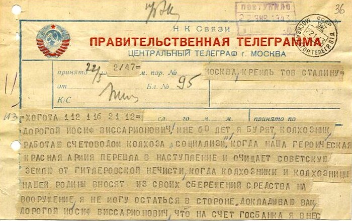 На тот момент эта сумма была достаточно крупной для простого рабочего. К примеру, танк «Т-34» первой модификации в 1941 году стоил 270 тысяч рублей, «Т-50» - 138 тысяч, а знаменитый пистолет-пулемет «ППШ-41» обходился в 500 рублей.