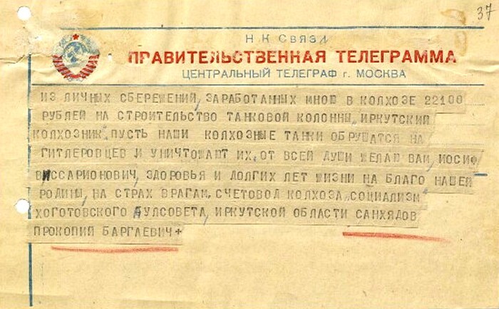 Стоит отметить, что в сообщении «Правды» от 21 января 1943 года на строительство этой танковой колонны колхозниками Иркутской области было собрано 58 млн рублей и пять килограммов золота.