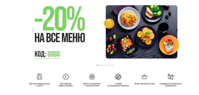 Urban Food - Лаконичный сервис: готовые «сытые» дни с набором приёмов пищи — завтрак, обед, полдник и ужин. Подходит тем, кто устал думать о комбинациях блюд и хочет сразу «всё в коробке». Доставка по Москве, на сайте простая навигация по тарифам; явных промокодов в открытом доступе не нашёл.