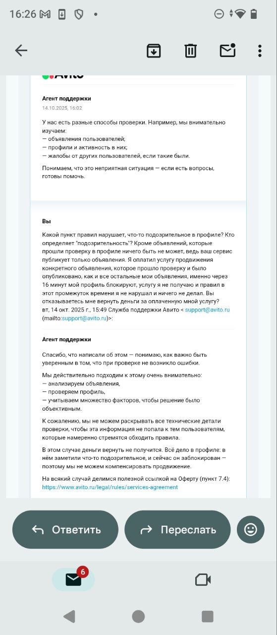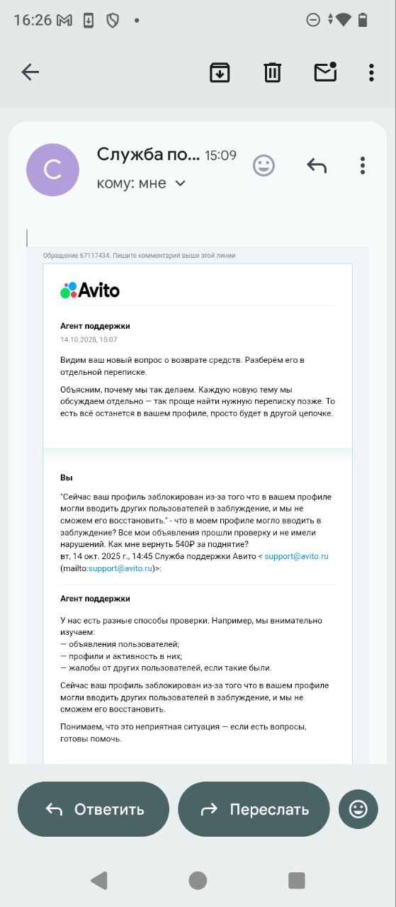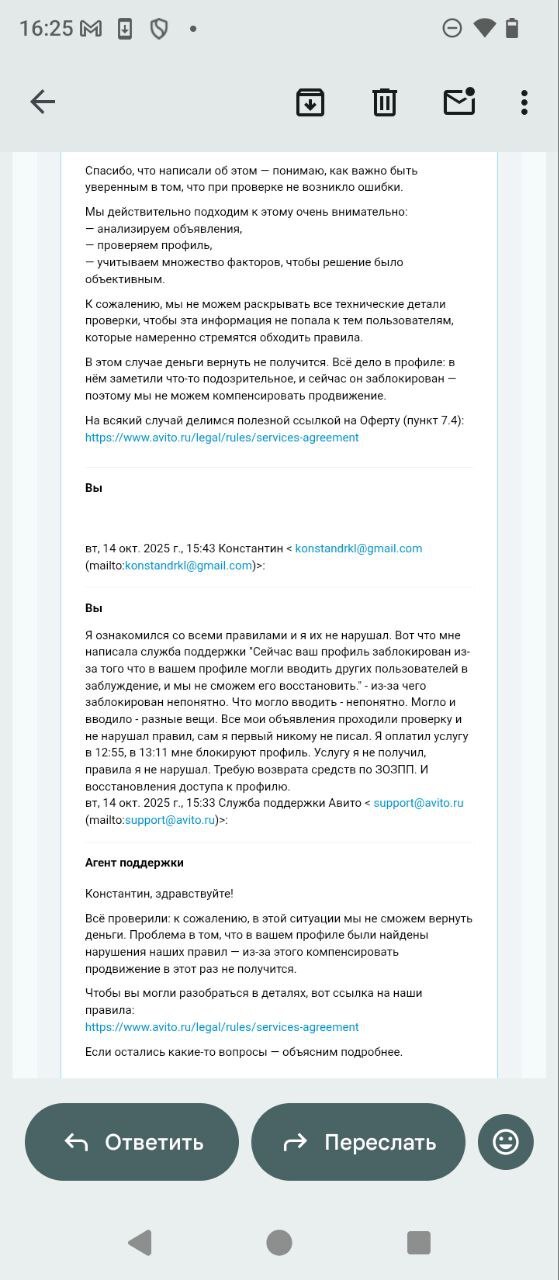 13:09, а его а 13:11. Я зарегистрировалась на этой платформе только вчера, исключительно для личного пользования (без коммерции) выложила на продажу комплект зимних шин, сумку, торшер. Звонков и сообщений ни от кого не было, сама я тоже никому не писала. Так же профиль подтвердила по документам. А сегодня в 13:09 пришло сообщение, что мой профиль заблокирован за нарушение правил без уточнения каких и почему. С супругом ситуация вышла еще интереснее, его профиль был заблокирован через 15 минут после поднятия объявления за 540₽, но он в этот момент был на работе, а я дома. У него профиль был уже давно и тоже с привязанными персональными данными. Никаких жалоб на него не было. Служба поддержки отвечает шаблонами, полностью игнорируя проблему пользователя и его вопросы, максимально наплевательское отношение. Деньги за услугу, которые не выполнили возвращать отказываются, а ссылаются на то, что в профиле было, что-то подозрительное, хотя кроме объявлений в профиле моем ничего не было, а все мои объявления проверку прошли, как и мужа. На вопрос какой же пункт правил это нарушает, поддержка не отвечает и что конкретно подозрительного одновременно в двух аккаунтах нашли тоже, хотя повторюсь,!.!) я создала аккаунт только вчера. @Avito.help как нам восстановить доступ к профилю? Мой профиль Авито привязан к почте ekaterinalps72@gmail.com . Я не нарушала правил, я была зарегистрирована на вашем сайте меньше суток.