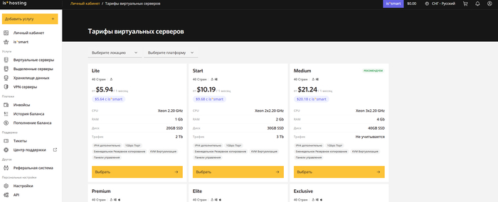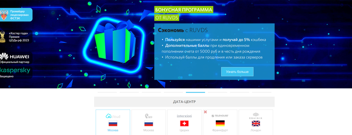Большой выбор дата-центров – Москва, Европа (Цюрих, Лондон и др.).