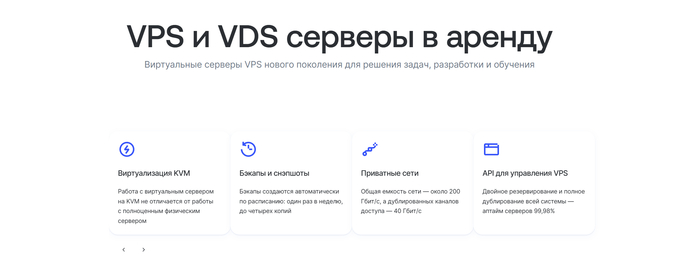 Российский провайдер, предлагает VPS/VDS на KVM и OpenVZ с SSD/SAS-накопителями, стартовыми тарифами от 75 ₽/мес, возможность выбрать локацию в России, Европе или США, часто используют для сайтов, приложений и телеграм-ботов из-за баланса цена/качество.