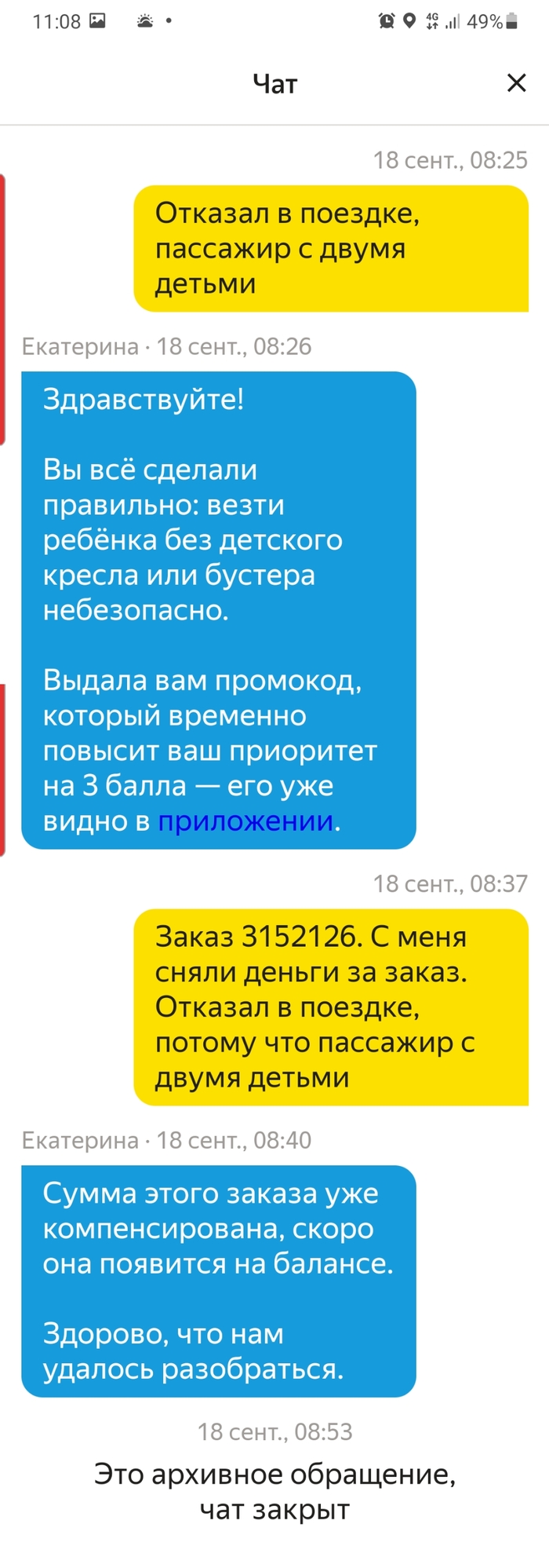 6. Еще одна классика, приехал по эконому, но вышли с детьми, отказался везти, а затем с меня сняли компенсацию за заказ, пишем, получаем деньги обратно. Зачей счет этот банкет, не понятно