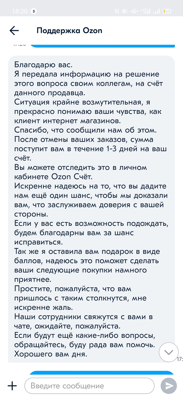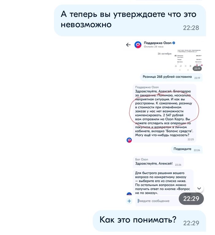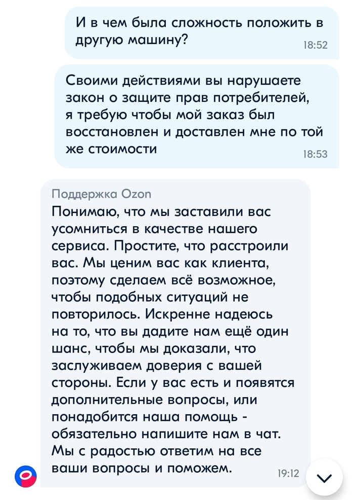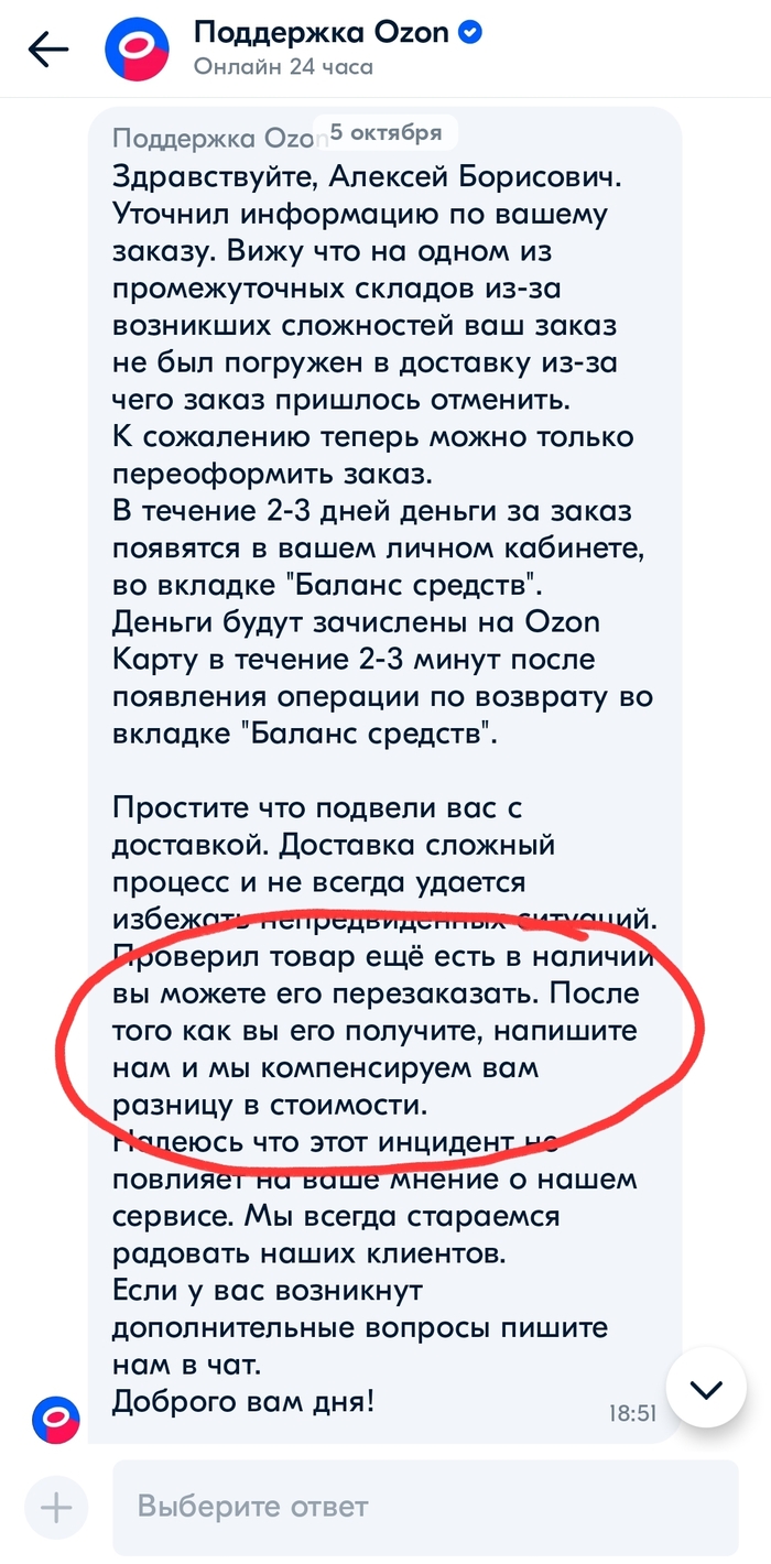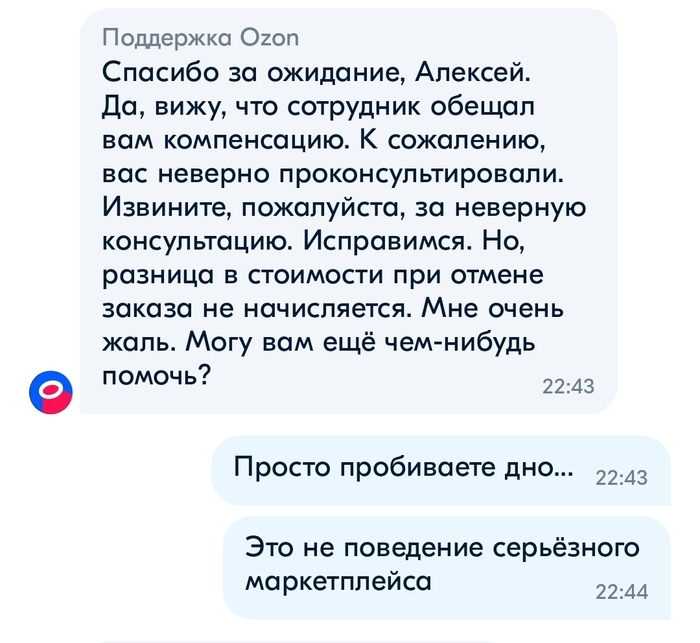 Во-вторых ссылаются опять на ошибку, но как выяснилось из этого поста Озон хозяин своих слов случай не единичный, да и в комментариях под моим постом люди отметились что попадали в такую же ситуацию. Причем что интересно, изучив скрины в обоих постах я пришёл к выводу что, текст ответа о компенсации идентичен, следовательно используется готовый скрипт, а значит разговоры об ошибке оператора вряд-ли соответствуют действительности.