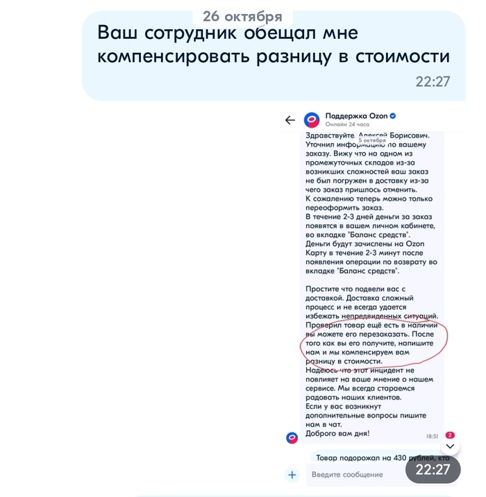 Заблаговременно заказал на озоне подарок племяннице на день рождения. Через какое-то время озон отменил мой заказ. Соответственно меня это не устроило и я обратился в поддержку, там мне предложили повторить заказ и так товар на тот момент подорожал обещали компенсировать разницу в цене. На моё требование восстановить заказ мне ответили отпиской.