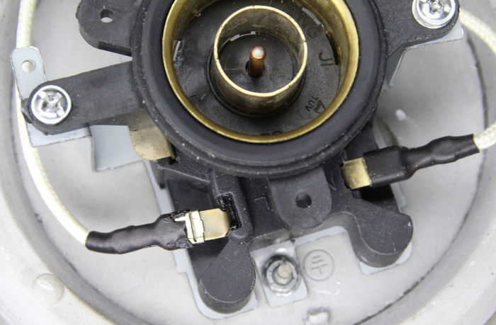 На фото оплавление клеммы из-за нагрева в контакте защиты от перегрева.