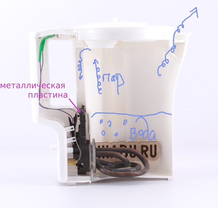 г) От постоянного контакта с паром, брызгами жесткой воды пластинка может поменять свои свойства, и отключать чайник преждевременно, или наоборот не отключать вовсе.