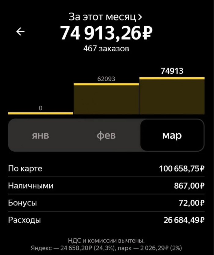 За 22 дня этого месяца я выполнил 467 заказов, что вполне немало, не каждый еще столько осилит. «Грязными» заработал 100 658 рублей, комиссия «Яндекса» и таксопарка составила 26 684 рубля. Аренда машины в сутки стоит 1525 рублей, на 22 дня — 33 550. На бензин в среднем уходило 1200 в сутки, соответственно, 26 400 рублей [за этот период].