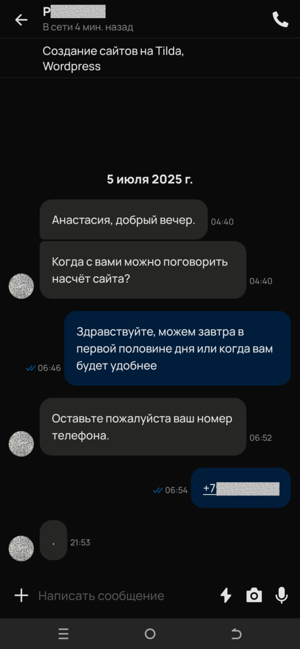 Само общение было немногословным. Человек поинтересовался моими контактами, через 15 часов ответил точкой, и больше со мной не связывался: ни по переписке, ни по телефону. И я про него не вспоминала. На этом общение закончилось.