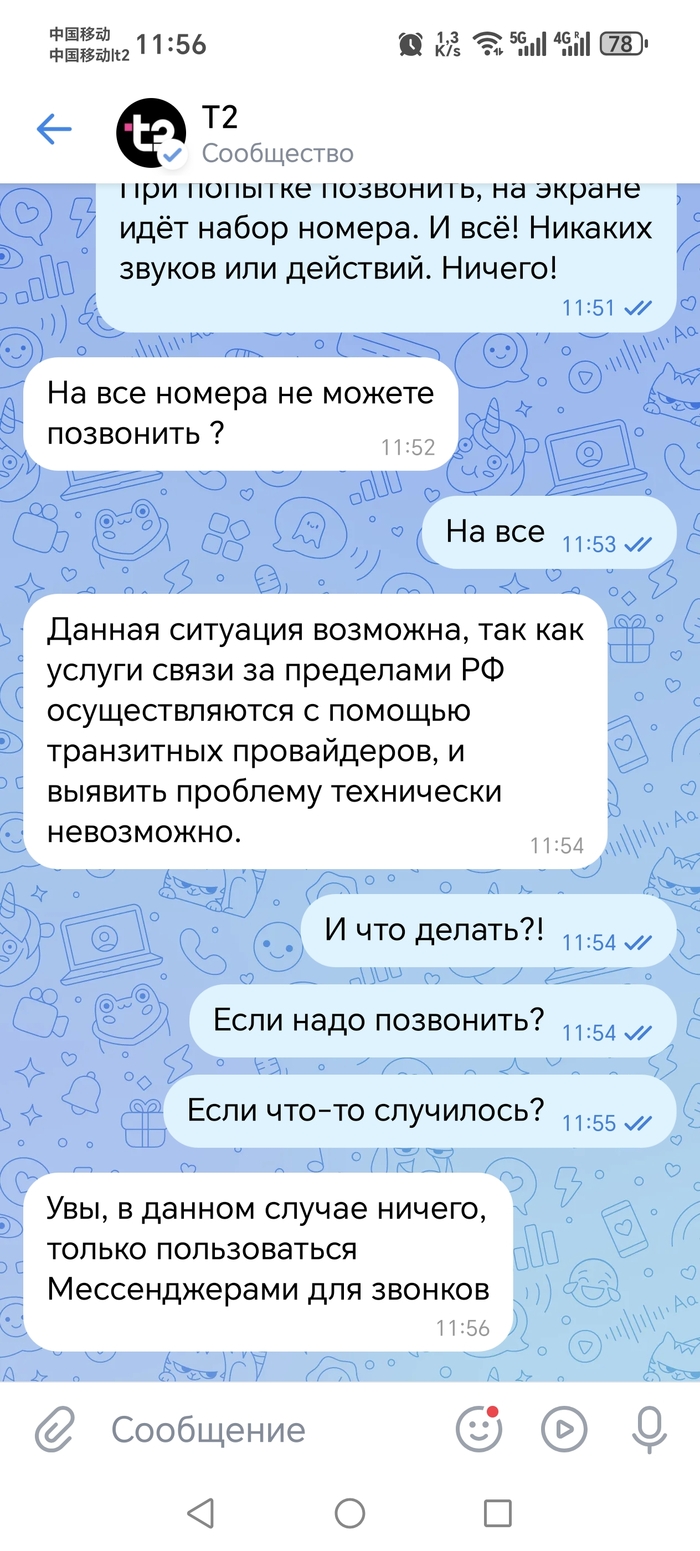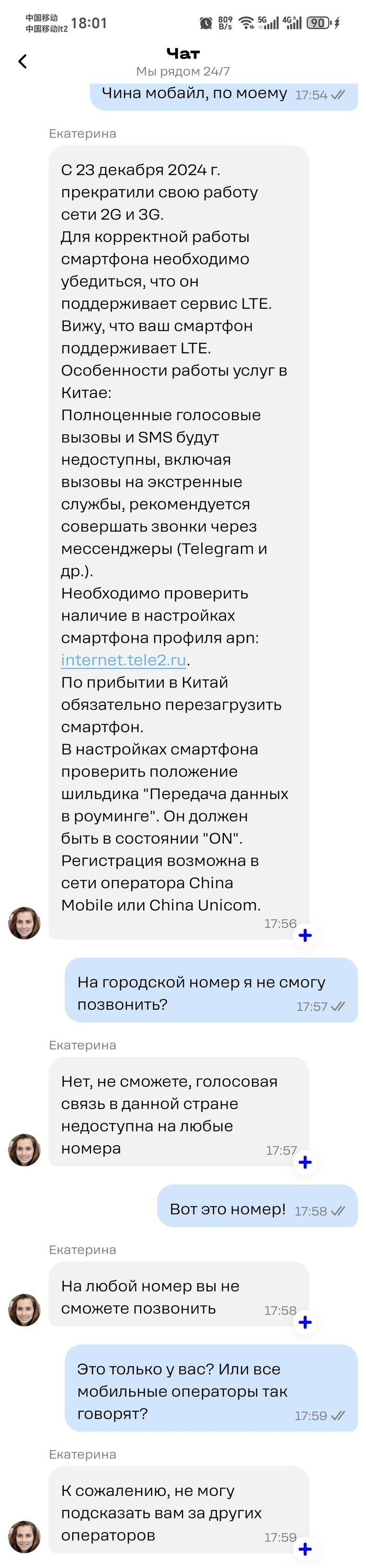 Открыл приложение Теле2, написал в поддержку. В ответ получил отказ. Говорят, что теперь звонить из Китая нет возможности. И как теперь быть? Непонятно! Ниже скрин переписки с оператором.