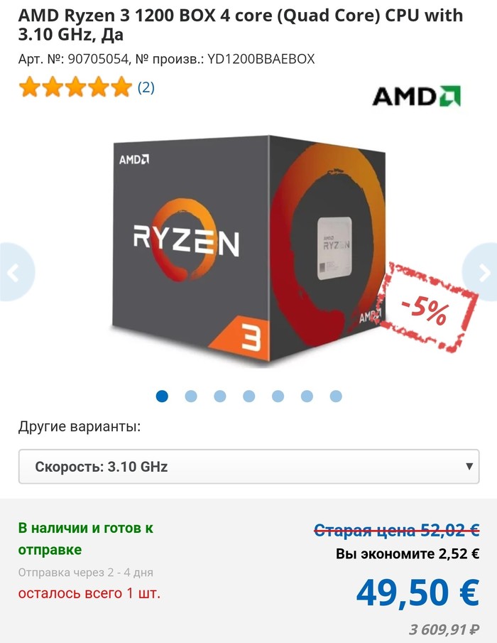 Итак процессор,единственный и еще не вышедший в продажу Ryzen R9 3900x,12 ядер,24 потока с базовой частотой 3.8GHz,цена 500$ или 32500р,как вы понимаете купить его я не смог и как временную затычку приобрел самый младший R3 1200 всего за 3600р!И что приятно удивило,с небольшим разгоном он почти равен i7 2600k в играх,для меня это было шоком,первые минут пять не мог понять что происходит,думаю что скорее всего дело в оперативной памяти DDR3 против DDR4.