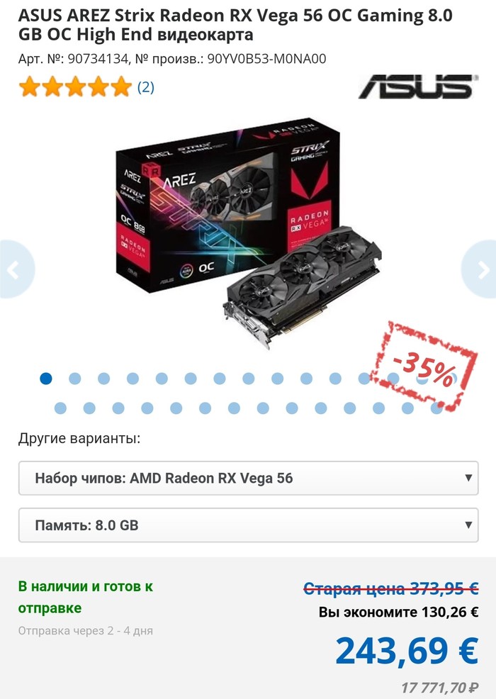 Две бесподобные Vega 56 от Asus,абсолютные аналоги GTX 1080 и 1070Ti.Когда я только начинал закупку железа,я и не мог предположить насколько это мощные и холодные видеокарты.Всего одна карточка тянет любые новые игры 2560х1440 на максимальных,но без сглаживания MSAA(на таком разрешении смысл сглаживания 0),fps при этом очень стабильный и не просаживаеться ниже 50,и это при учете того,что у меня сейчас стоит R3 1200!Представьте какой будет прирост при установке второй карты и R9 3900X.