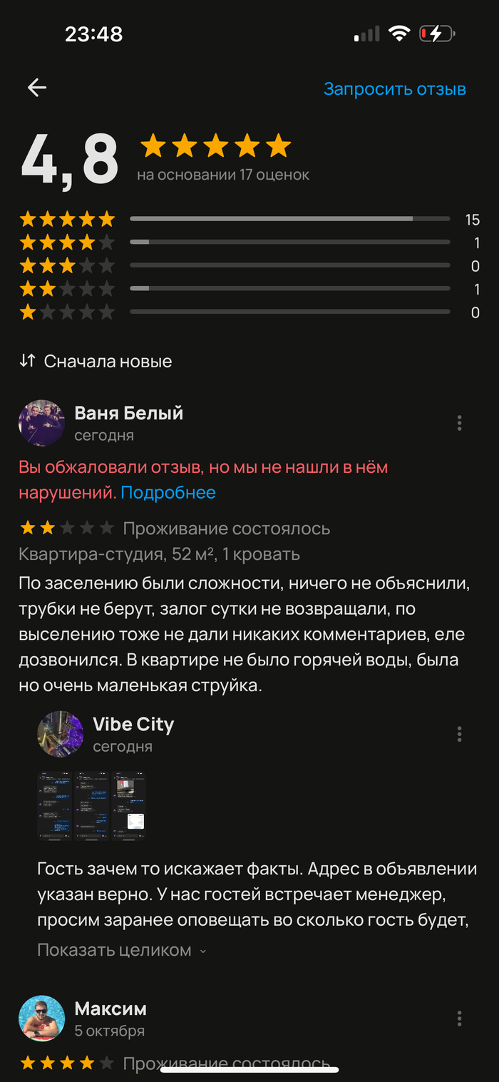 При обжаловании отзыва, получали стандартные отписки авито, что гость высказал свое мнение и все нормально, хотя по скринам видно , что гость врет. В каких целях он это делает не известно. Гостя ждал менеджер, чтоб помочь с заселением, были на связи всегда. И вернули залог вовремя. В отзыве какие то противоположные вещи. И авито на это никак не реагирует. Беря свой процент и зарабатывая на нас, авито просто не заинтересованно чтобы через их сервис нормально работать и написать про нашу компанию может кто угодно и что угодно, а в ответ получите что все хорошо. Гость прав, даже когда не прав. @Avito.help когда ваш сервис дойдет до человеческого отношения не только к потребителям, а к компаниям которые честно работают и постоянно купаются в каком то негативе не за что!