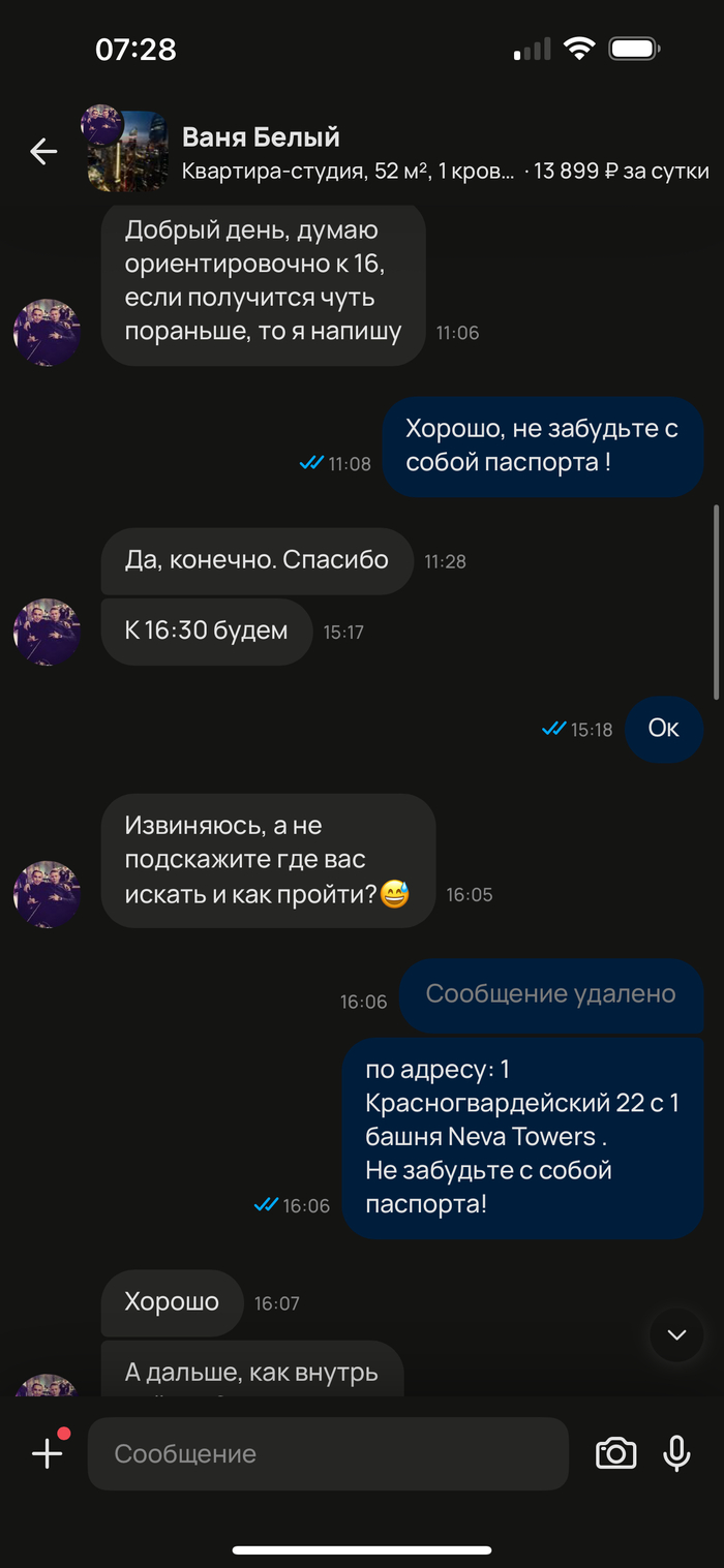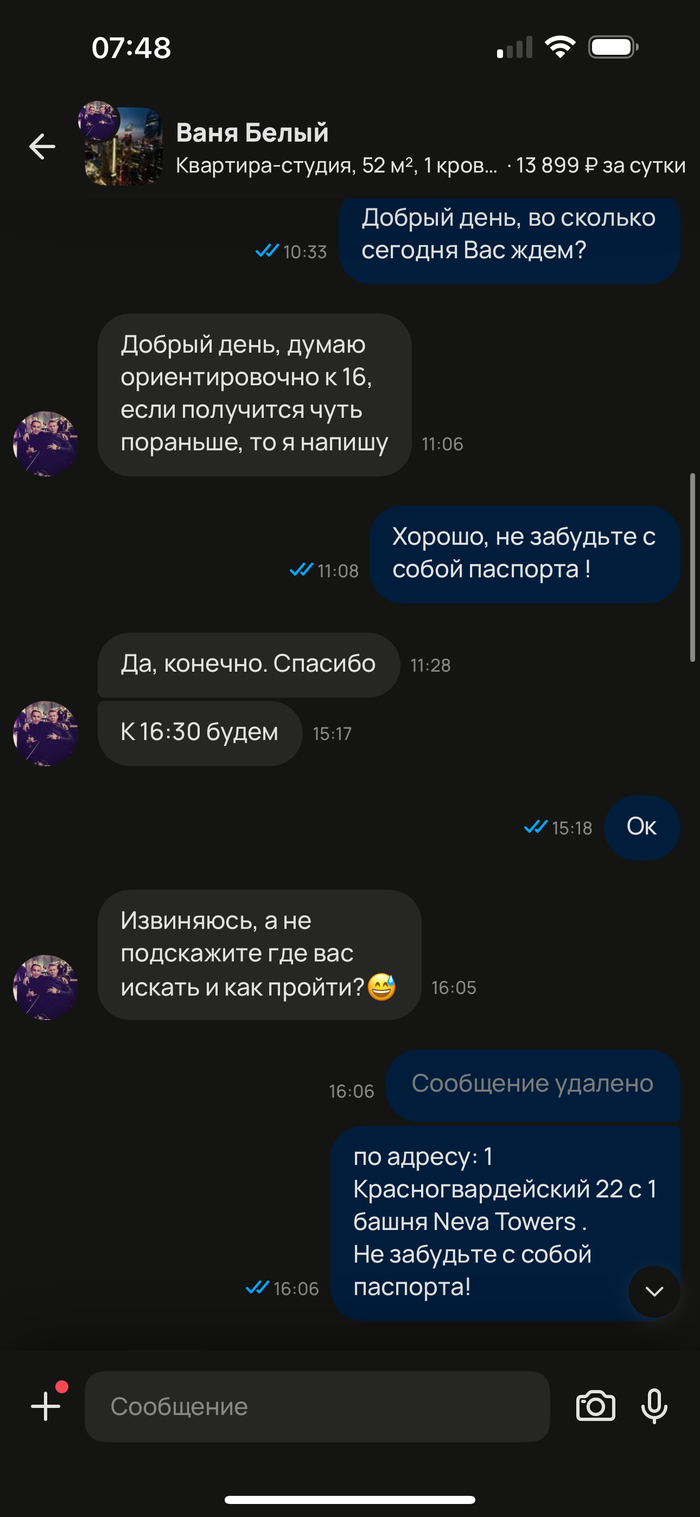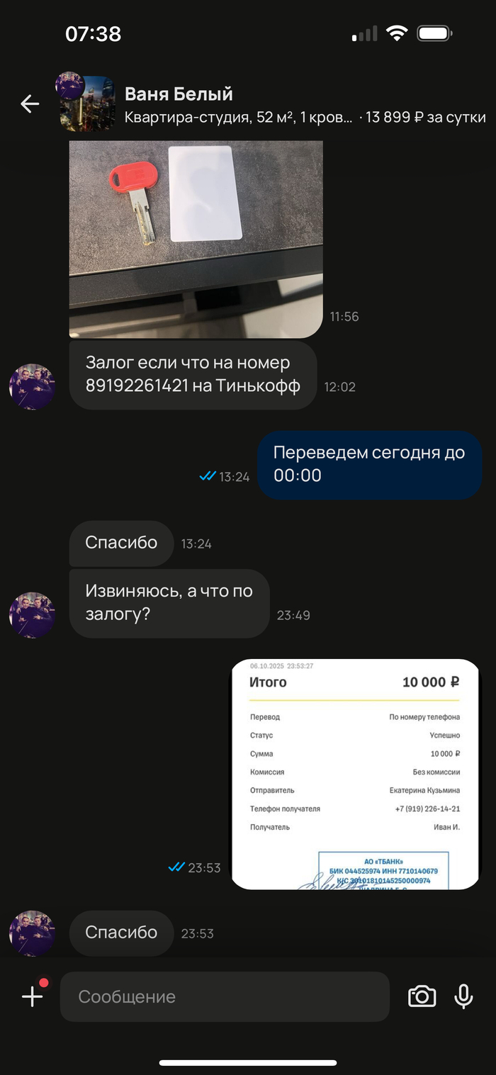 Гостя заселили, гость расплатился. В день выезда гость так же позвонил, проинформировали его по выезду. Дозвонился он с первого раза. Дальше гостю проинформировали что залог вернется до 00:00 после проверки апартамента на кражу, порчу и сдачу гостевых карт. Гостю вернули залог как и обещали, но гость зачем то приукрасил, что ему возвращали сутки залог, хотя видно по переписке в этот же день, когда и выехал гость, что опять клевета со стороны гостя.