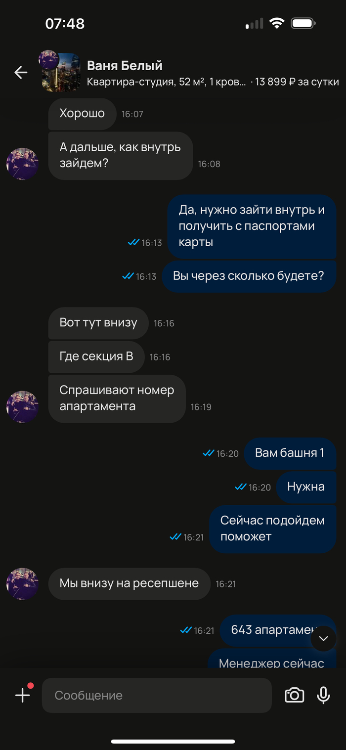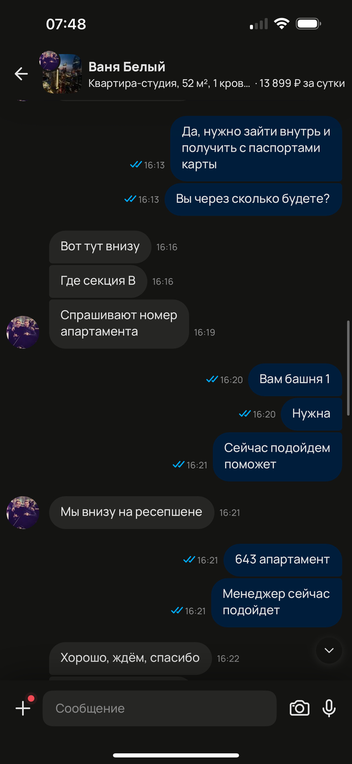 Гость твердит про какие то сложности, что мы не выходи с ним на связь якобы. Причем у нас гостей встречает менеджер и помогает с заселением. Как можно при таком раскладе поймать трудности с заселением, только гостю понятно. Мы уточнили во сколько будет гость назвал время 16:30, сам приехал к 16:00, ему почти моментально отвечали на все вопросы и помогли с заселением.