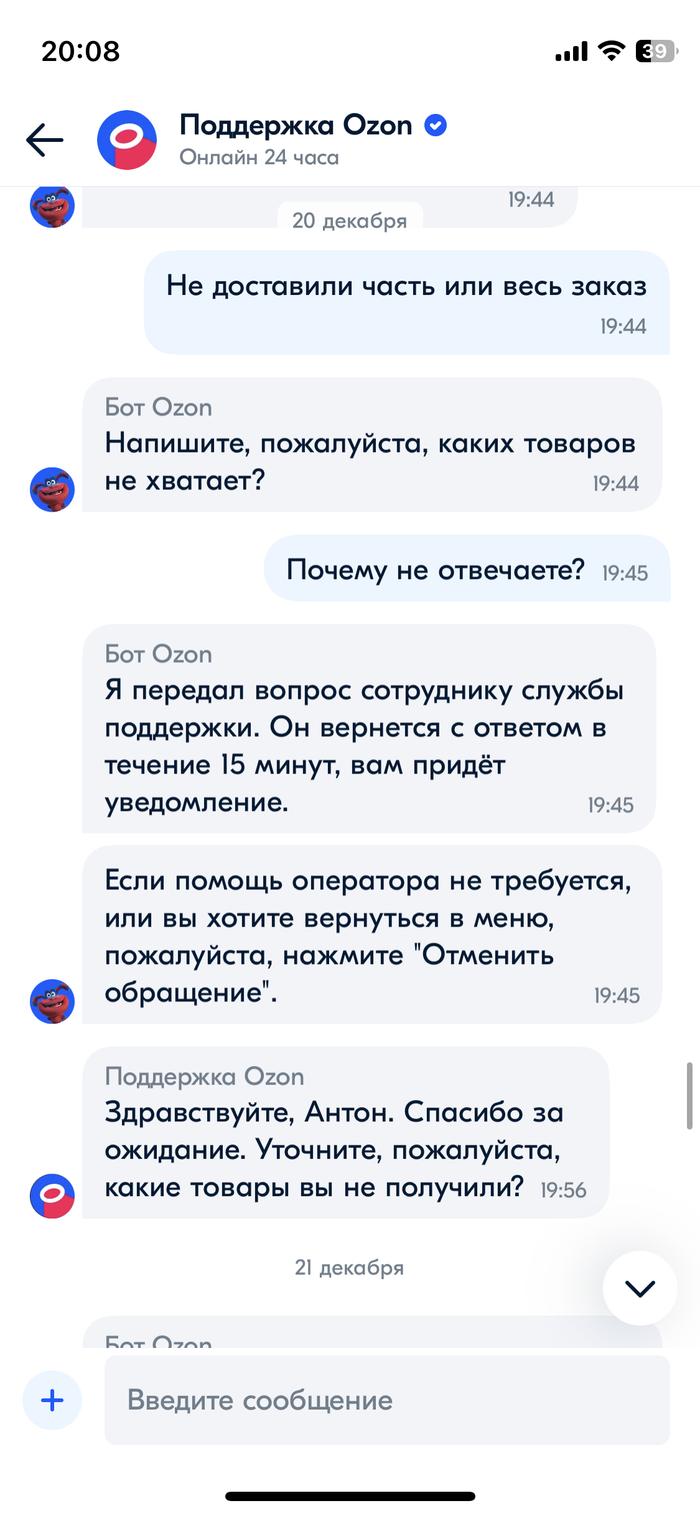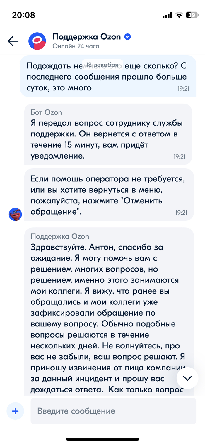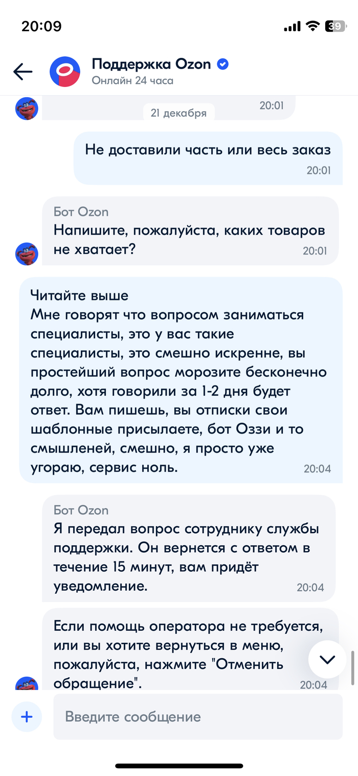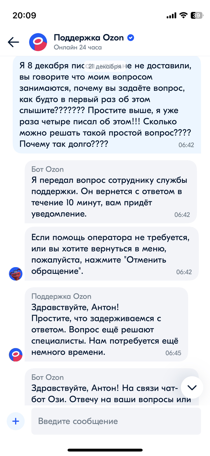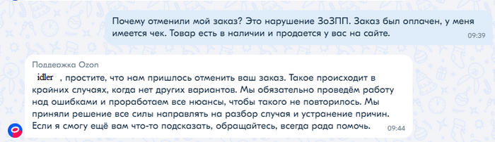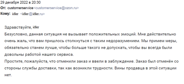 И так еще несколько дней подряд. В конце концов такое отношение мне надоело, и я решаю 25 декабря написать претензию озону или ООО "Интернет решения". Форма претензии и требование выдать мне товар в разумные сроки, такие же, как со сбермегамаркетом. Но вместо счастливого финала 26 декабря озон отменяет заказ. После чего начинается моя длительная переписка со службой поддержки и их футболом в отношении меня.