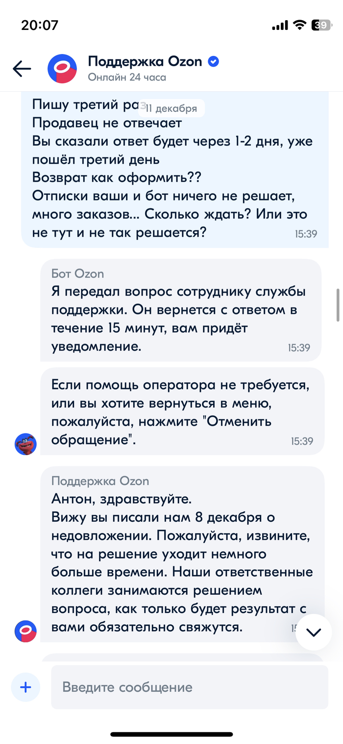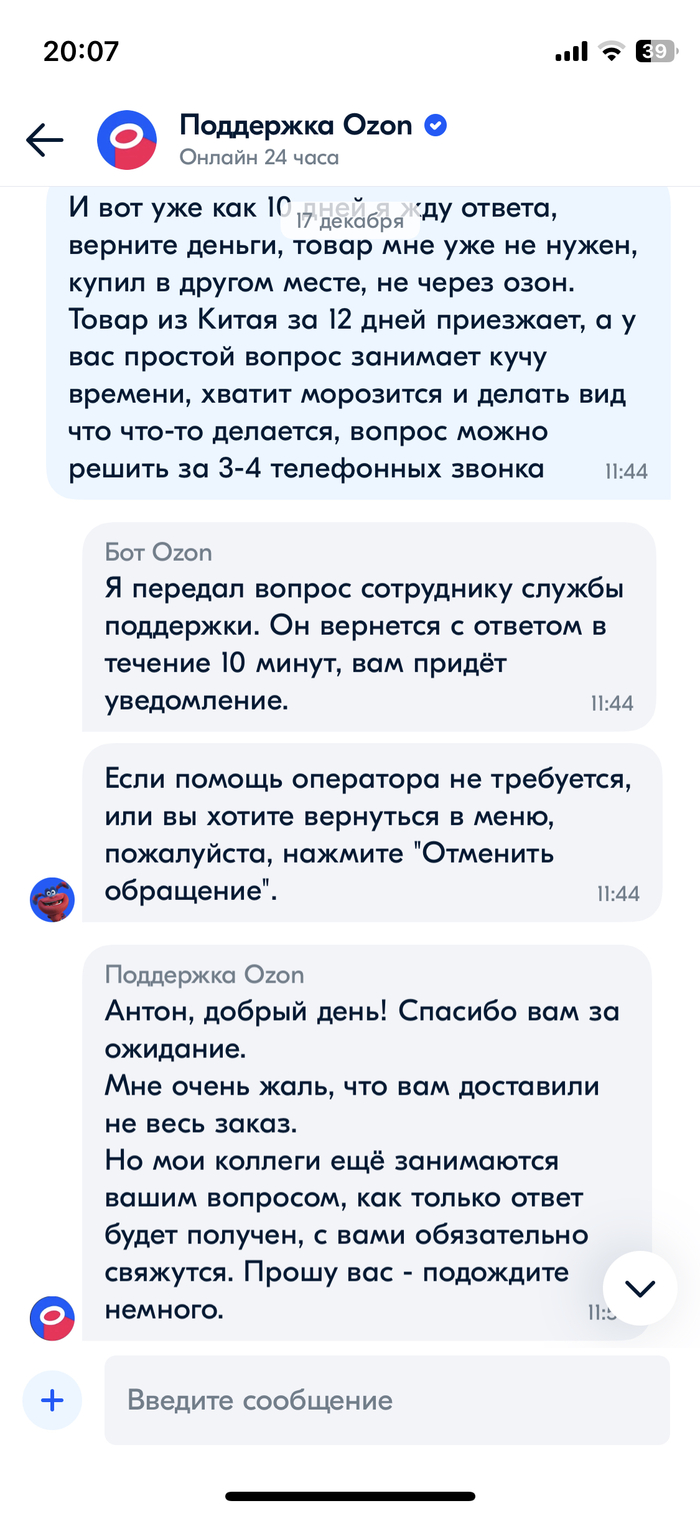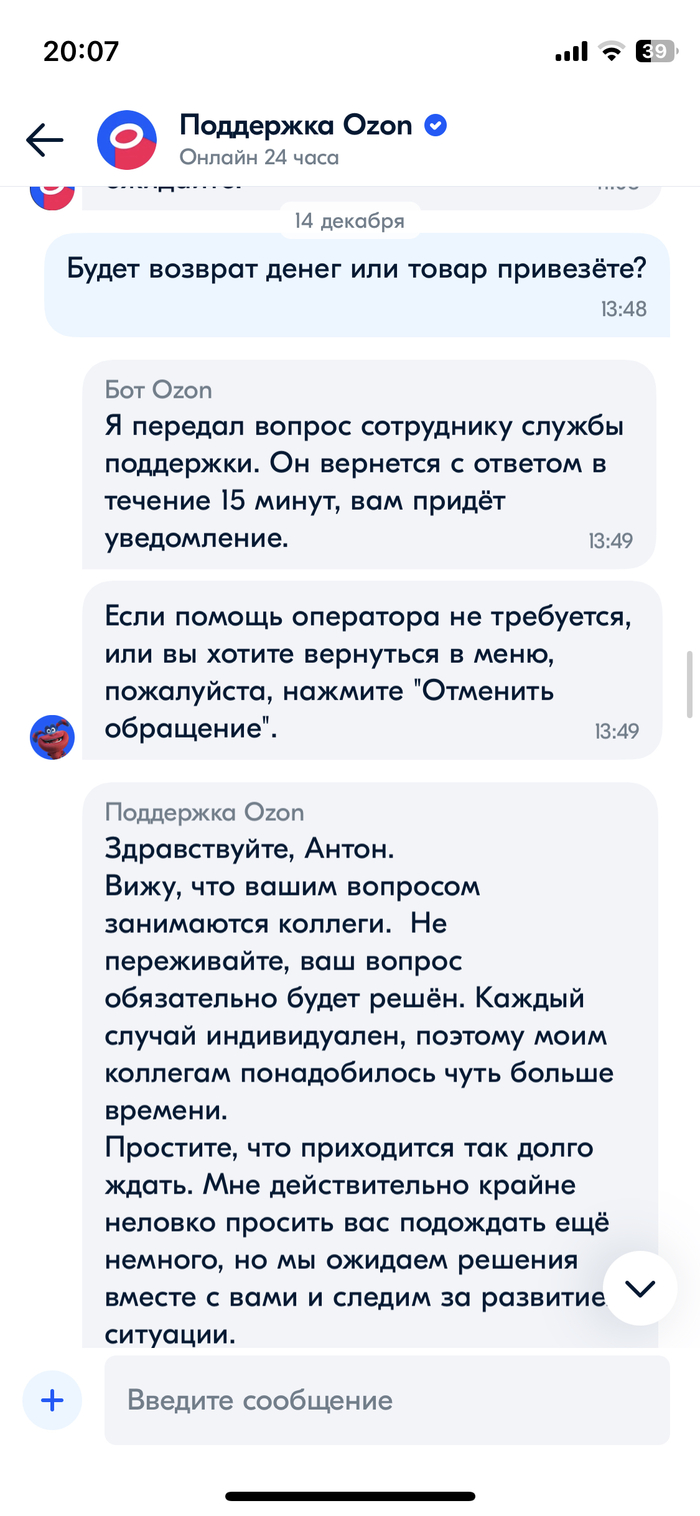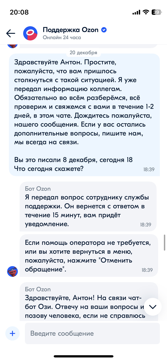 И так еще несколько дней подряд. В конце концов такое отношение мне надоело, и я решаю 25 декабря написать претензию озону или ООО "Интернет решения". Форма претензии и требование выдать мне товар в разумные сроки, такие же, как со сбермегамаркетом. Но вместо счастливого финала 26 декабря озон отменяет заказ. После чего начинается моя длительная переписка со службой поддержки и их футболом в отношении меня.