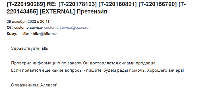 Получаю отписку (скрин выше), а также информацию, что с продавцом не так уж легко связаться. Но также оператор напоминает, что доставку товара должен осуществлять озон. После начинается перекладывание ответственности, а я в свою очередь пытаюсь понять, с кого же все-таки спрос, кто доставлял заказ и по чьей вине его отменили. Помимо общения в чате, я вел переписку и по электронной почте, так как туда поступил ответ на претензию. На очередной мой вопрос, о том, на ком же ответственность и кто осуществлял доставку товара, получаю такой ответ: