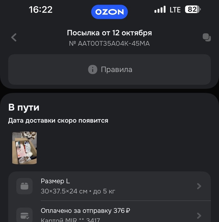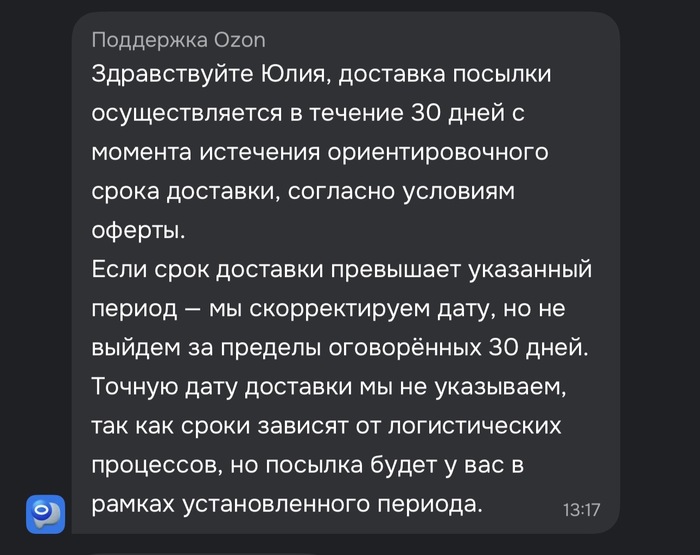 AAT00T35A04K-45MA Отдыхала в Адлере, купила много вещей себе, и в подарок семье, в ручную кладь не было возможности взять. Решила отправить посылку разрекламированным Озоном, да и времени уже оставалось мало, а озон был рядом с гостиницей) 12.10 отправила посылку с Адлера себе же в родной город. Дата доставки стояла 19.10, потом перенеслась на 21.10, потом на 23.10, но вот срок снова перенесли и дату уже более суток не назначают. Поддержка? Шаблонные ответы мол ждите 30 дней. С каких пор вообще посылки нельзя отследить, когда везде уже давно все отслеживается? Я не представляю даже. Начиталась тут историй, как все теряют, утилизируют, и понимаю, что с каждым днем надежда на приезд посылки угасает. Коробка L размера, как её потерять то можно было? Ну или просто украли. Озон, если у вас еще хоть какая-то совесть после всех жалоб и историй осталась, верните посылку! Подвели так подвели..