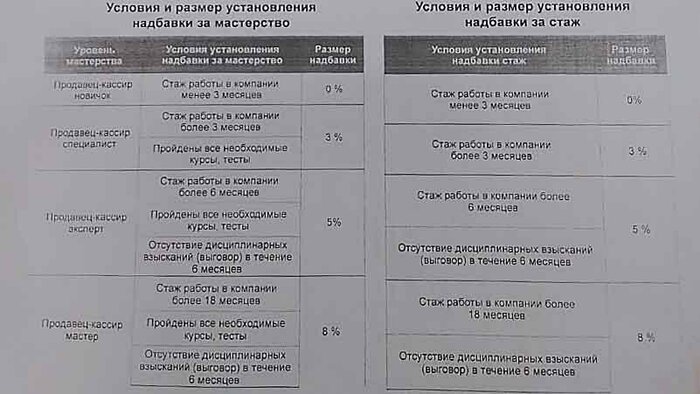 Как рассказывают бывшие сотрудники, на оплате труда постоянно экономят. Так, в июле изменились условия труда. В новом договоре были прописаны новые ставки за час работы (меньше, чем было) и новые условия получения премии — упомянутые составляющие и покупка акционного товара кассирами, если он не продается. А если кассир не согласен, то не будет премии. Новый договор уменьшил оплату труда сотрудников на 3-5 тысяч рублей.